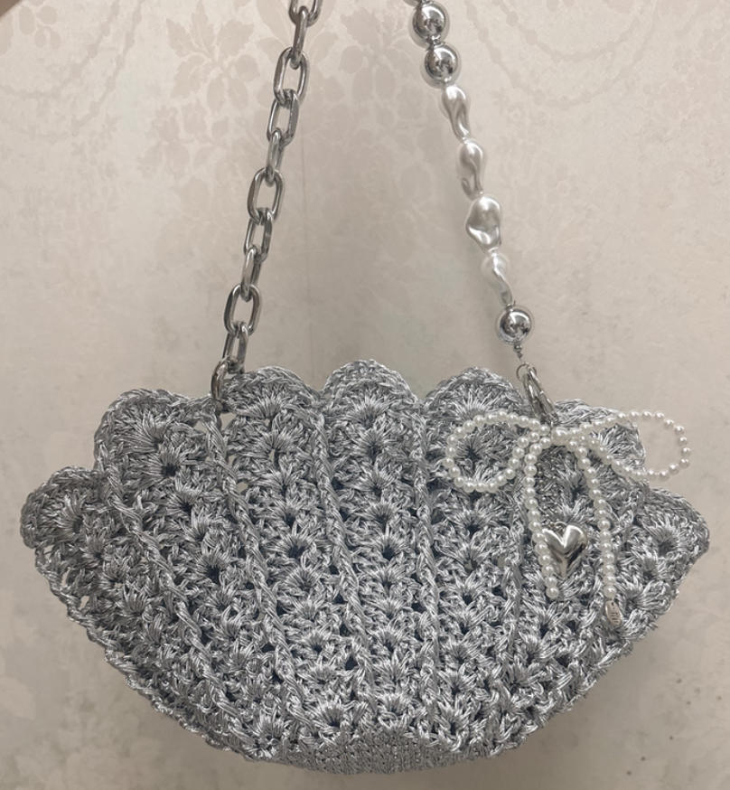 This sparkling seashell-shaped handbag is made with metallic yarn and can hold your phone, earphones, lipstick, and other small items.